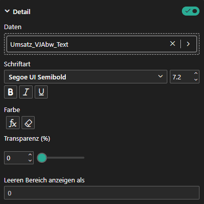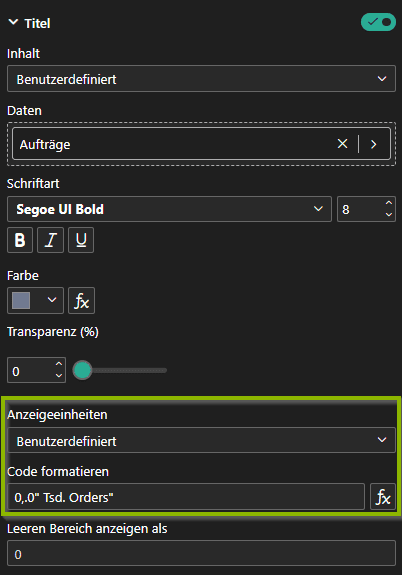 - Spare dir zusätzliche Measures, indem du die eingebauten Formatierungsoptionen der Datenbeschriftungen direkt nutzt (z. B. “Tausende”, “Millionen” oder Benutzerdefiniert). Beachte: Dies funktioniert nicht für Text-Measures.