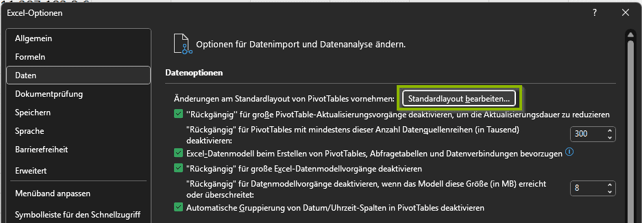 Öffne Excel, klicke in der Menüleiste oben links den Punkt Datei. Unten links findest du Optionen. Wähle nun die Kategorie Daten, ganz oben findest du die Option Änderungen am Standardlayout von PivotTables vornehmen. Klicke auf den Button Standardlayout bearbeiten