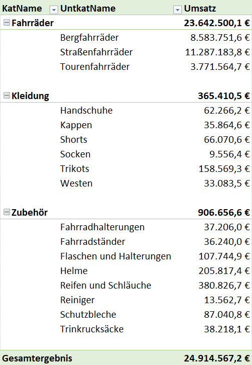 Bei der Tabellenform wird jedes Zeilenfeld in einer separaten Spalte angezeigt, und die Zwischensummen erscheinen unterhalb der Gruppen. Das ist das Layout, das am ehesten einer “normalen” Exceltabelle ähnelt und sich hervorragend zum Kopieren, Filtern und Weiterverarbeiten der Daten eignet. Das spart dir unzählige Klicks und Aufräumarbeiten.