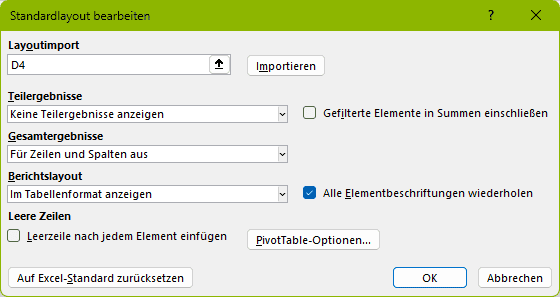 Das PivotTable Standardlayout ist eine globale Einstellung in Excel, mit der du definierst, wie jede neue PivotTable standardmäßig aussehen soll (z.B. Layout, Teilergebnisse, Spaltenbreiten). Es ist deine persönliche Vorlage für alle zukünftigen PivotTables. - Der Sinn dahinter