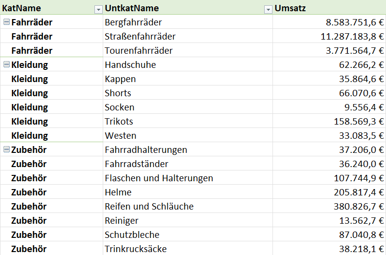 Hier wird jedes Zeilenfeld in einer eigenen Spalte angezeigt, was schon mal viel besser ist. Allerdings werden Zwischensummen oberhalb der einzelnen Gruppen angezeigt, und es können unnötige Leerzeilen entstehen. Eine Verbesserung, aber noch nicht das Optimum. - Tabellenformat (Empfehlung!)