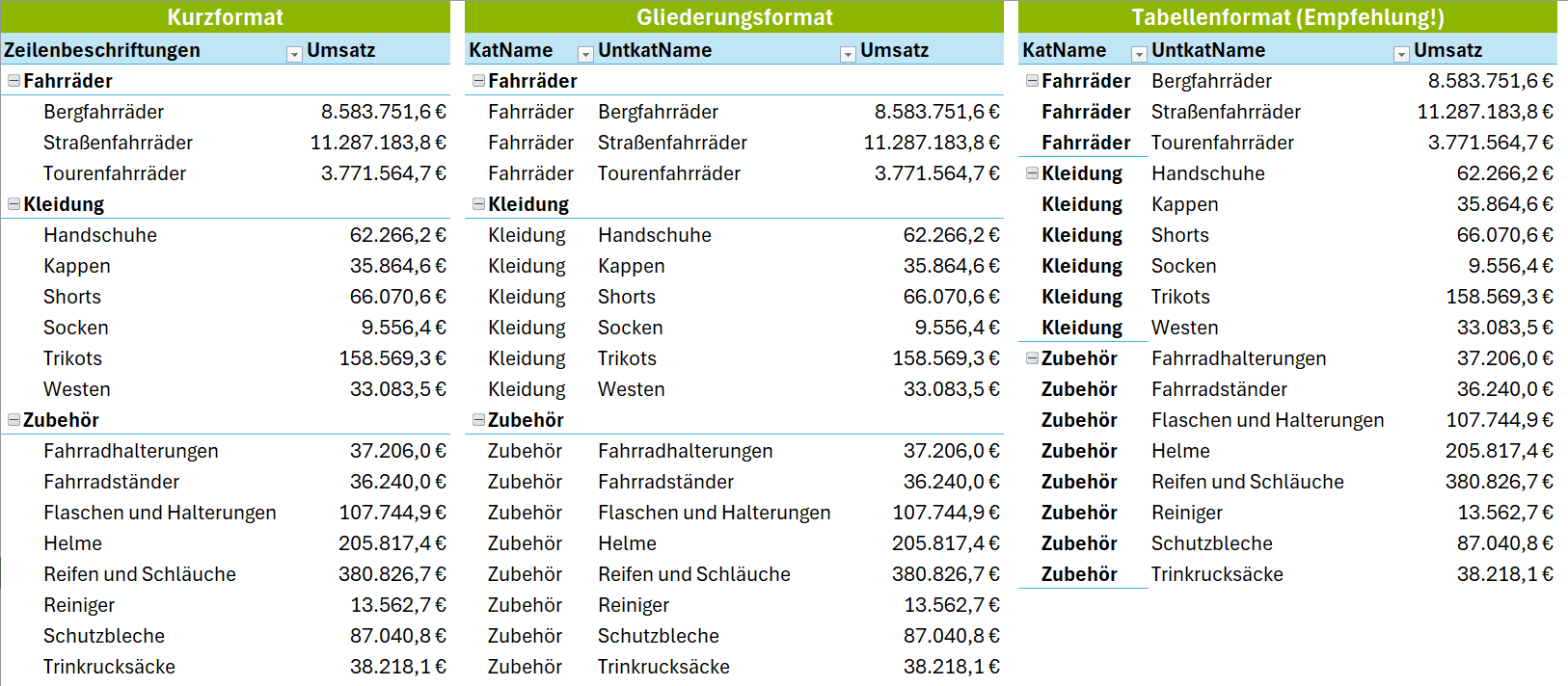 Das ist der oft nervigste Punkt, den man immer wieder manuell ändern muss. Hier legst du fest, wie deine Zeilenelemente im PivotTable dargestellt werden.- Kurzformat