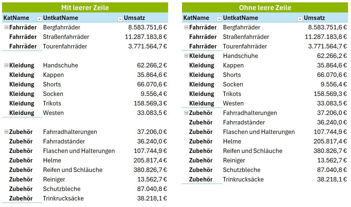Mein Tipp: Überlege, wie du deine PivotTables meistens nutzt. Als Quelle für Daten (z. B. zur Gruppierung) sind Gesamt- & Teilergebnis störend, für Analysen unerlässlich. - Leere Zeilen nach jedem Element